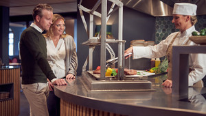 The lunch buffet consists of a wide variety of hot and cold dishes, with our chefs preparing several of them live for you. The range varies according to the seasons. Examples include various salads, luxury breads, meat and fish specialties, hors d'oeuvres, regional products, dairy products, fresh fruit and various other delicacies; too many to mention. And of course coffee / tea / milk and various juices are included!