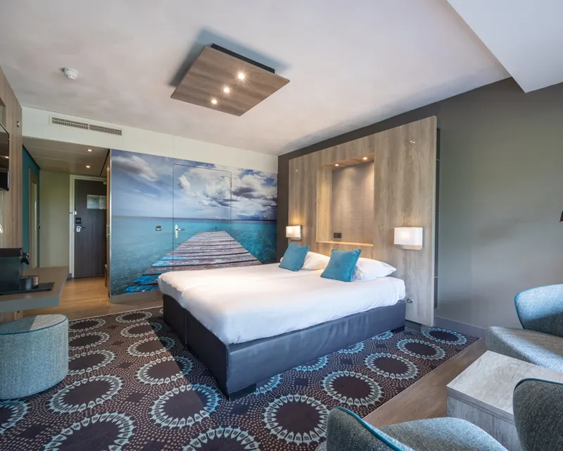 Vernieuwde, modern gerestylde kamer met balkon of terrasje, een badkamer met bad óf inloopdouche, twee bedden (boxsprings), airconditioning, bureau, koffertafel, zitje, safe, telefoon met buitenlijn, TV, föhn, toilet, balkon of terras, strijkplankje, koffie & thee faciliteiten, balkon of terras. Tevens gratis breedband wifi, flatscreen (streaming mogelijk o.a. Netflix). Gratis entree tot welness & fitness centre (Toucan Health Club) en hotelcasino. Betaalbaar comfort in de regio Tilburg - Breda.