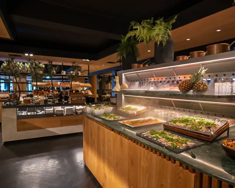 Het lunchbuffet bestaat uit een grote diversiteit aan warme- en koude gerechten, waarbij onze koks verschillende daarvan live voor u bereiden. Het assortiment wisselt naar gelang de seizoenen. Te denken valt bijvoorbeeld aan diverse salades, luxe broodsoorten, vlees- en visspecialiteiten, hors-d'oeuvres, streekproducten, zuivel, vers fruit en diverse andere lekkernijen; te veel om op te noemen. En natuurlijk zijn koffie/thee/melk en verschillende sappen inbegrepen!